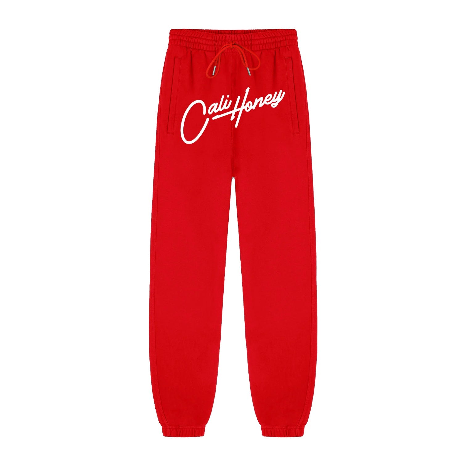 French terry without fleece 100% cotton 9 oz red sweatpants with front and back puff screen print.