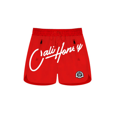 Waterproof nylon shorts red with white screen print and black silicon logo patch and mesh lining inside.