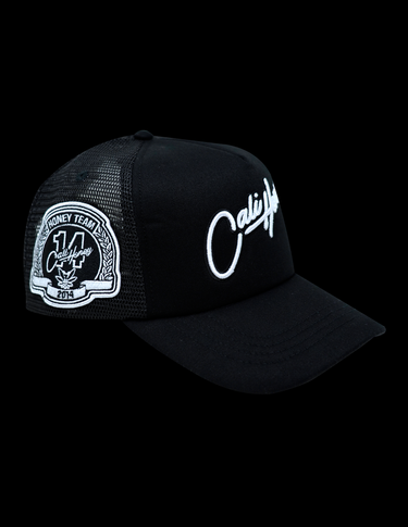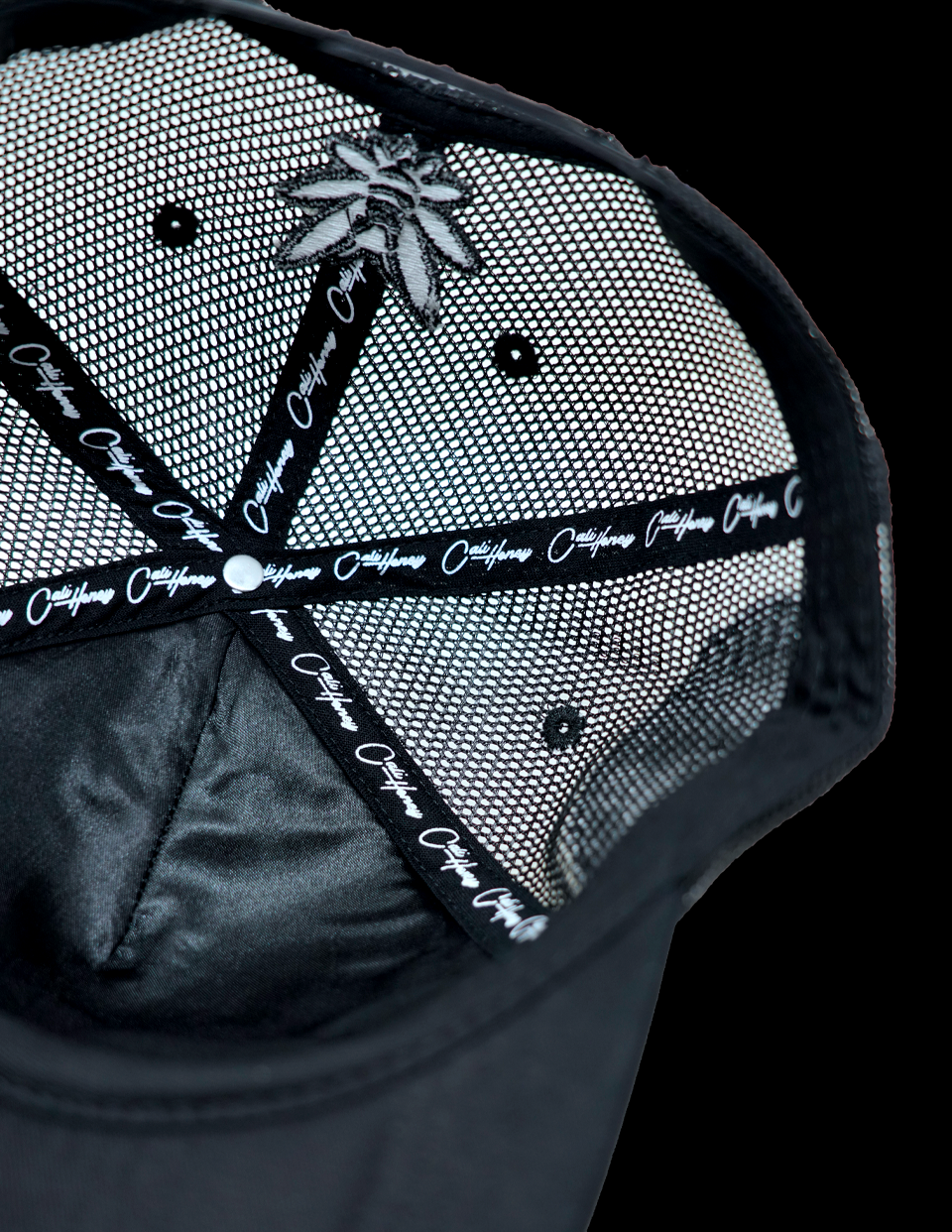 Premium polyester for front panels and brim, mesh for side/back panels.