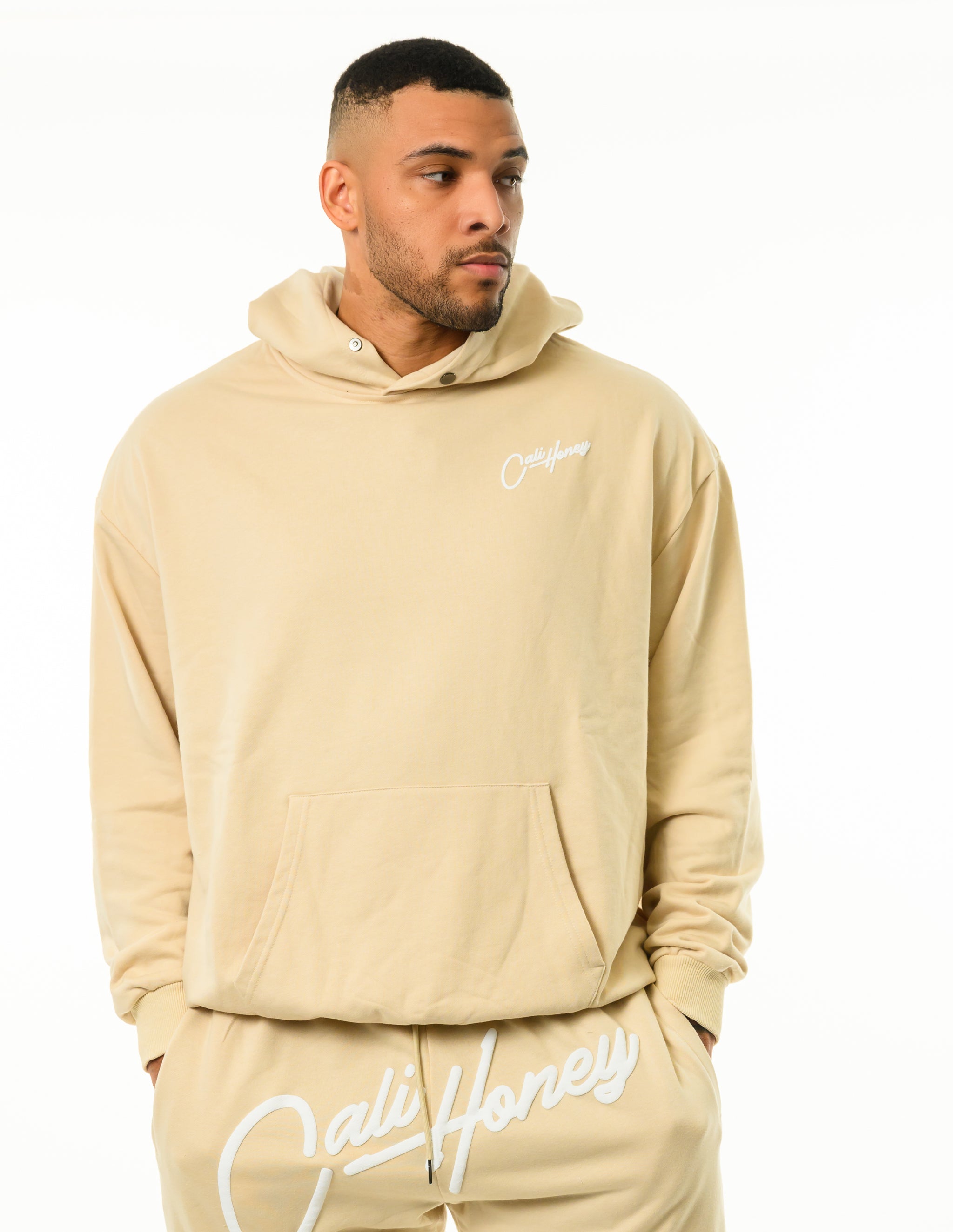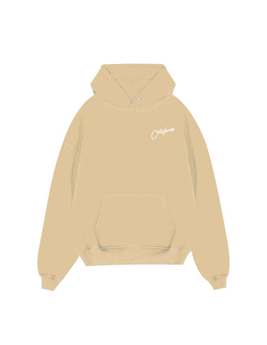 French terry without fleece 100% cotton 9 oz beige hoodie with front and back puff screen print.