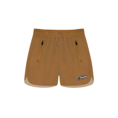 ylon shorts tan with black silicon logo patch and mesh lining inside.